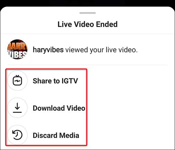 Instagram finira votre vidéo en direct. Vous verrez maintenant un menu "Vidéo en direct fini", ce qui vous permet de décider de ce que vous aimeriez faire avec l'enregistrement de votre vidéo en direct.