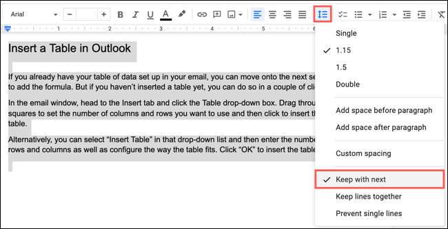 Cliquez sur le bouton d'espacement de la ligne dans la barre d'outils ou allez au format & GT; Espacement de ligne du menu. Ensuite, sélectionnez "Garder avec la prochaine" pour passer une chèque à côté de celui-ci.