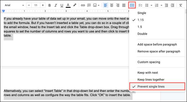 Ensuite, cliquez sur le bouton d'espacement de la ligne dans la barre d'outils ou allez au format & GT; Espacement de ligne du menu. Ensuite, sélectionnez "Empêcher les lignes simples".