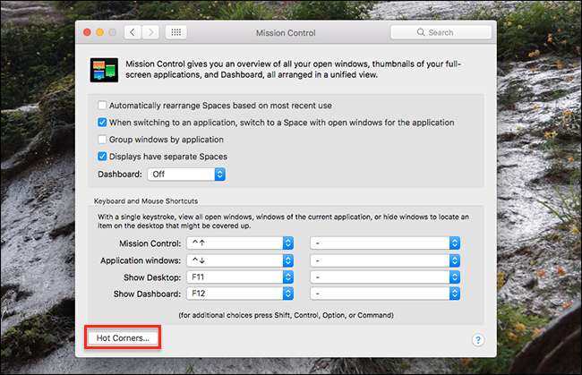 Hot Corners est l'une de ces fonctionnalités que les utilisateurs de Mac aiment ou ignorent complètement. Si vous aimez la fonctionnalité, vous pouvez l'utiliser pour verrouiller votre écran. Tout d'abord, assurez-vous que votre écran est configuré pour se verrouiller lorsque le système est inactif, comme nous l'avons vu précédemment. Ensuite, allez dans Préférences Système> Mission Control et cliquez sur le bouton «Hot Corners».