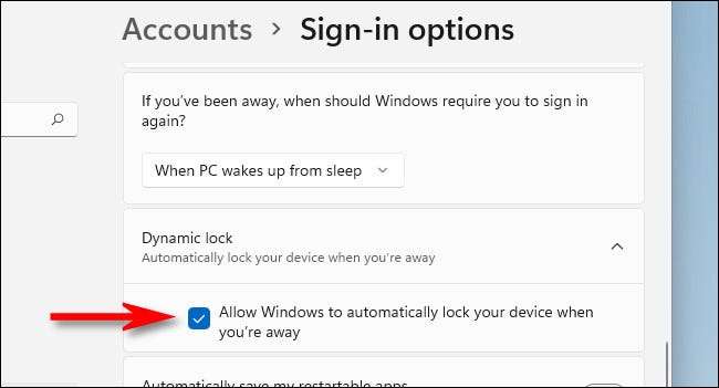 Ensuite, faites défiler jusqu'à ce que vous voyiez «verrouillage dynamique». Ci-dessous cela, placez une coche dans la case à côté "Autoriser Windows de verrouiller automatiquement votre appareil lorsque vous êtes absent."