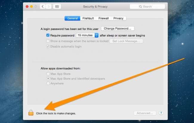 Ouvrez les Préférences Système, cliquez sur l'icône Sécurité et confidentialité. Une fois que vous y êtes, cliquez sur l'icône de verrouillage dans le coin inférieur gauche.