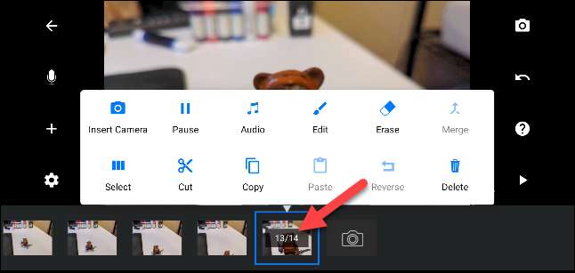 Vous pouvez faire défiler la chronologie inférieure pour voir tous les cadres. Appuyez sur une image pour afficher des outils d'édition pour le cadre spécifique. C'est là que vous pouvez supprimer des cadres ou insérer de nouveaux.