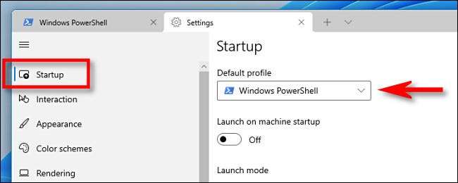 Lorsque l'onglet Paramètres s'ouvre, sélectionnez "Démarrage" dans la barre latérale. Sur la page Paramètres de démarrage, cliquez sur le menu déroulant intitulé "Profil par défaut".