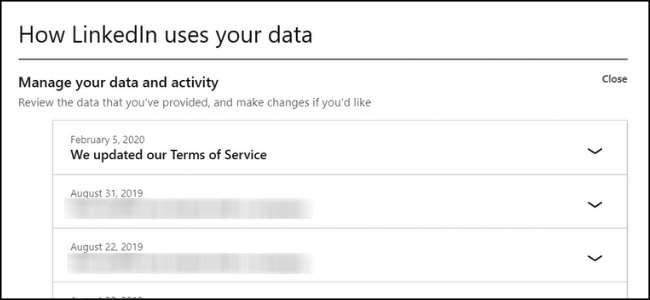 Le premier est «Gérez vos données et votre activité», qui fournit un journal de chaque fois que vos données ont été partagées avec un tiers, tel qu'un employeur ou un service lié. Vous pouvez également voir les dates de votre les contacts ont été synchronisés , lorsque vous avez modifié un paramètre de confidentialité important ou lorsque LinkedIn a mis à jour ses conditions d'utilisation.