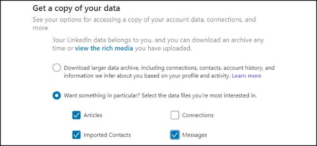 Vous pouvez également demander une version archivée des données sur votre compte LinkedIn avec le paramètre «Obtenir une copie de vos données». Vous disposez des options suivantes lors du téléchargement de vos informations: