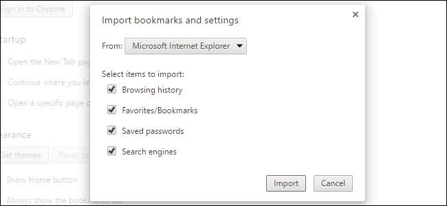 Sélectionnez Microsoft Internet Explorer ou Edge pour importer les données. Chrome ne peut importer vos favoris que depuis Edge, mais il peut importer des favoris, des mots de passe enregistrés, l'historique de navigation et des moteurs de recherche enregistrés à partir d'Internet Explorer.