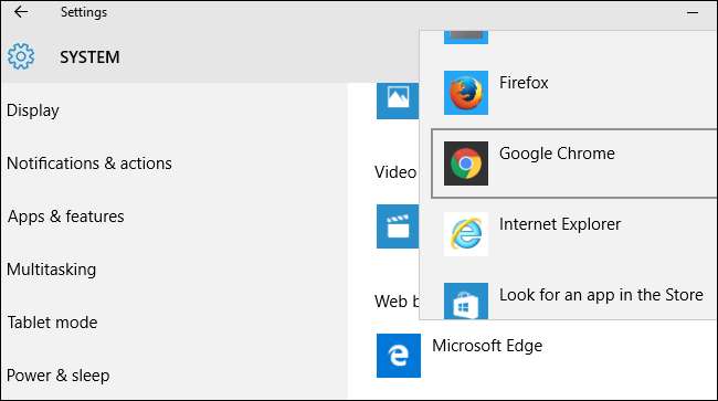 Sur Windows 10, ce bouton ouvrira à la place l'écran Paramètres> Système> Applications par défaut. Vous devrez faire défiler vers le bas, cliquer sur "Navigateur Web" et sélectionner "Google Chrome" dans la liste des navigateurs Web installés.