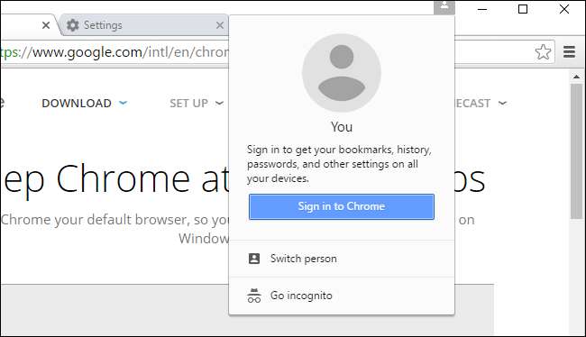 Si vous possédez un compte Google (comme une adresse Gmail), vous pouvez vous y connecter en cliquant sur le bouton de profil dans la barre de menu et en cliquant sur «Se connecter». Vous n’avez pas à faire cela si vous ne le souhaitez pas. Vous pouvez utiliser Chrome sans jamais vous connecter avec un compte Google, et les choses devraient bien fonctionner.