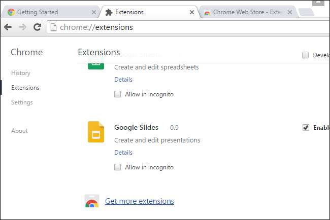 Si vous souhaitez des fonctionnalités supplémentaires qui ne sont pas fournies avec le navigateur, cliquez sur le bouton de menu dans le coin supérieur droit de la fenêtre du navigateur Chrome et sélectionnez Plus d'outils> Extensions. Cliquez sur "Obtenir plus d'extensions" au bas de cette page pour visiter le Chrome Web Store , où vous pouvez télécharger et installer une variété d'extensions gratuites, ainsi que des thèmes qui changent l'apparence de Chrome. Si vous disposiez de modules complémentaires de navigateur pour Internet Explorer, vous devrez installer une version Chrome de l'extension à partir du Chrome Web Store