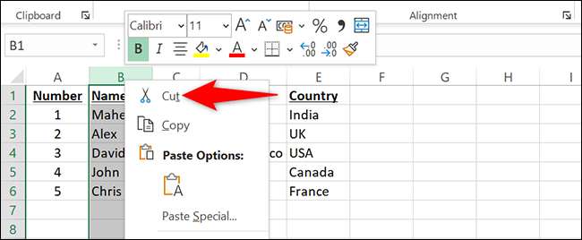 Pour utiliser cette méthode, trouvez la colonne que vous souhaitez déplacer dans votre feuille de calcul. Cliquez avec le bouton droit sur la lettre en haut de cette colonne et sélectionnez "Couper" dans le menu.