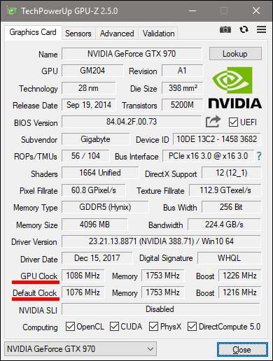 Vérifiez GPU-Z pour vous assurer que votre GPU utilise la nouvelle valeur d'horloge de base. Après avoir appliqué les modifications dans Afterburner, GPU-Z devrait afficher l'horloge «active» par défaut et l'overclock nouvellement appliqué dans les champs «Horloge par défaut» et «Horloge GPU», respectivement.