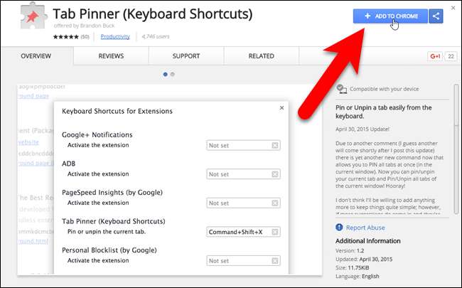 Pour épingler et détacher des onglets à l'aide de raccourcis dans Chrome, nous allons utiliser une extension appelée Tab Pinner . Rendez-vous sur cette page et cliquez sur "Ajouter à Chrome" pour l'installer. Suivez les instructions à l'écran.