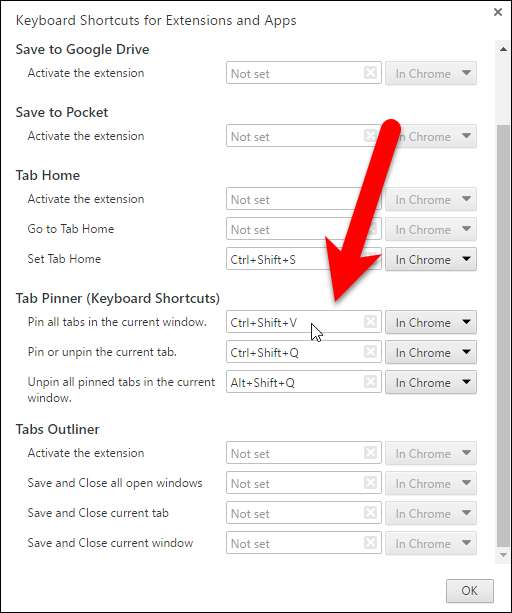 La boîte de dialogue Raccourcis clavier pour les extensions et applications vous permet de spécifier les raccourcis à utiliser avec certaines extensions et applications . Sous Tab Pinner (raccourcis clavier), les options «Épingler ou désépingler l'onglet actuel» et «Retirer tous les onglets épinglés de la fenêtre actuelle» se voient attribuer des raccourcis clavier par défaut, mais vous pouvez les modifier. L'option «Épingler tous les onglets dans la fenêtre actuelle» ne dispose pas initialement d'un raccourci clavier. Pour attribuer ou modifier les raccourcis clavier, cliquez simplement dans la case de l'option et appuyez sur la combinaison de touches que vous souhaitez utiliser.