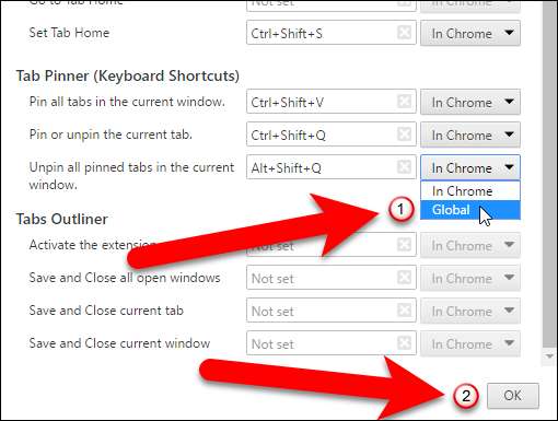 Si vous souhaitez pouvoir utiliser l'un de ces raccourcis dans les onglets de Chrome même lorsque Chrome n'est pas la fenêtre active, sélectionnez «Global» dans la liste déroulante à droite de la zone de raccourcis. Par exemple, cela pourrait vous permettre de désépingler tous les onglets de Chrome, même lorsque Chrome est réduit avec l'option "Détacher tous les onglets épinglés dans la fenêtre actuelle". Une fois que vous avez configuré vos raccourcis clavier, cliquez sur "OK" pour accepter vos modifications et fermer la boîte de dialogue.
