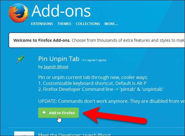 Dans Firefox, il existe un module complémentaire appelé Onglet Épingler / Détacher qui vous permet d'utiliser un simple raccourci clavier pour épingler et détacher l'onglet actuel. Accédez à la page du module complémentaire Pin / Unpin Tab et cliquez sur le bouton «Ajouter à Firefox». L'extension s'installe rapidement et ne nécessite pas de redémarrage de Firefox.