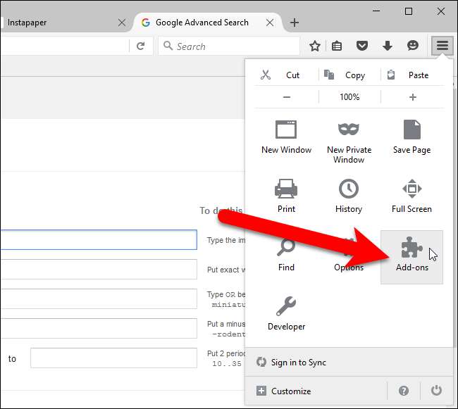 Pour accéder aux options de l'onglet Pin / Unpin, cliquez sur le menu Firefox (l'icône hamburger sur le côté droit de la barre d'outils) et cliquez sur l'icône «Add-ons».