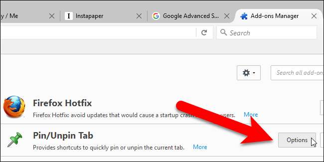 Cliquez sur le bouton "Options" pour l'extension Pin / Unpin Tab.