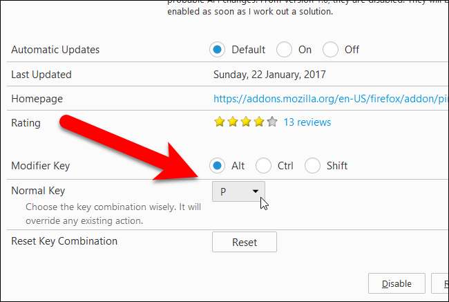 Sélectionnez une touche de modification à utiliser (Alt, Ctrl ou Maj) dans l'ensemble de boutons d'option «Touche de modification» et une lettre dans la liste déroulante «Touche normale». Assurez-vous de ne pas sélectionner une combinaison de touches déjà utilisée pour une autre action, car cette combinaison de touches remplacera l'action existante. Alt + P est la combinaison de touches par défaut.