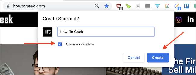 Si nécessaire, modifiez le titre du site Web dans la fenêtre qui apparaît. Sélectionnez l'option "Ouvrir comme fenêtre" pour ouvrir le site Web comme sa propre application, puis cliquez sur le bouton "Créer".