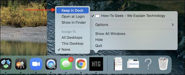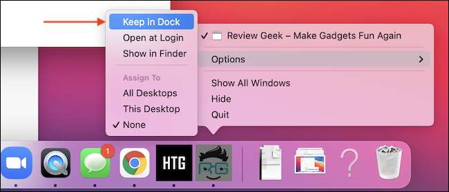 Maintenant que l'application a été créée, il est temps de Ajoutez-le au quai . Si l'application est déjà en cours d'exécution, cliquez simplement sur l'icône de l'application et choisissez Options & GT; Garder dans le quai.