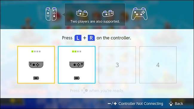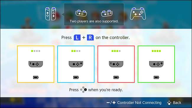 Vous pouvez ajouter jusqu'à quatre joueurs en utilisant n'importe quelle combinaison de contrôleurs. Par exemple, si vous avez deux paires de Joy-Con, chaque moitié peut être un contrôleur autonome, permettant à quatre personnes de jouer. Dans ce cas, votre écran ressemblerait à ceci.