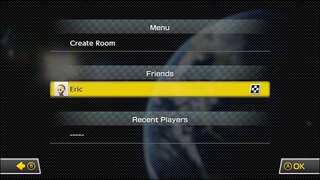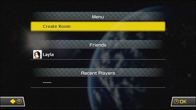 Tout comme dans Wireless Play, vous devrez créer une salle pour vous et vos amis. Vous verrez également une liste des personnes que vous avez ajouté comme amis . Vous pouvez les sélectionner dans le menu pour voir s’ils se trouvent déjà dans une pièce. Sinon, vous devrez en créer un. Sélectionnez Créer une pièce et appuyez sur A.