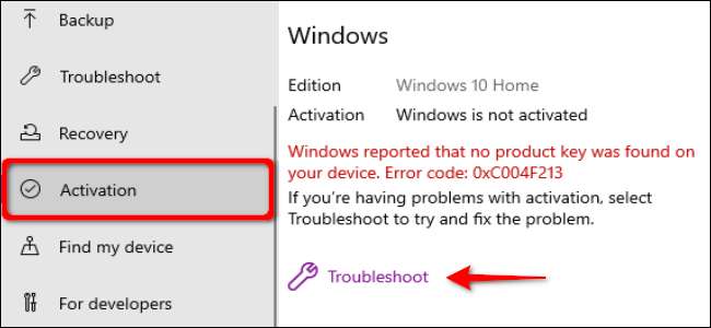 Sélectionnez «Activation» dans le menu de gauche. Vous devriez voir un message sur la droite indiquant «Windows ne peut pas être activé sur votre appareil» ou quelque chose de similaire. Cliquez sur le lien "Dépanner" affiché sous l'avertissement.