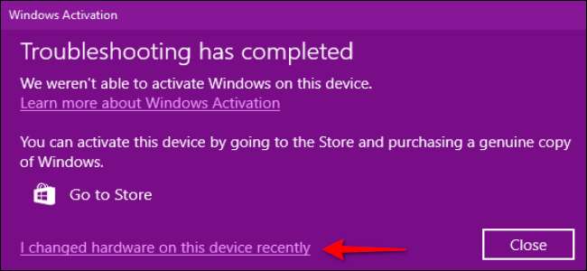 Dans la fenêtre contextuelle suivante, cliquez sur le lien «J'ai récemment changé de matériel sur cet appareil».