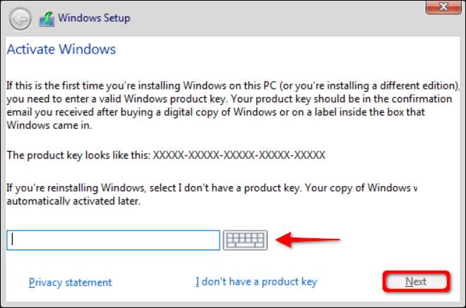 Lorsque vous commencez à réinstaller Windows 10, le processus d'installation vous invite à entrer une clé de produit. Entrez le code et cliquez sur le bouton «Suivant».