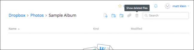 Pour ce faire, vous pouvez cliquer sur l'icône de la petite poubelle dans le coin supérieur droit. Il s'agit du bouton «Afficher les fichiers supprimés».