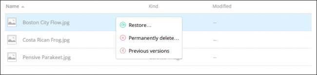 Pour restaurer le ou les fichiers, cliquez sur «Restaurer…» Évidemment, pour les supprimer définitivement, vous pouvez choisir «Supprimer définitivement…» ou afficher et restaurer les «versions précédentes» de ce fichier (s'il y en a).