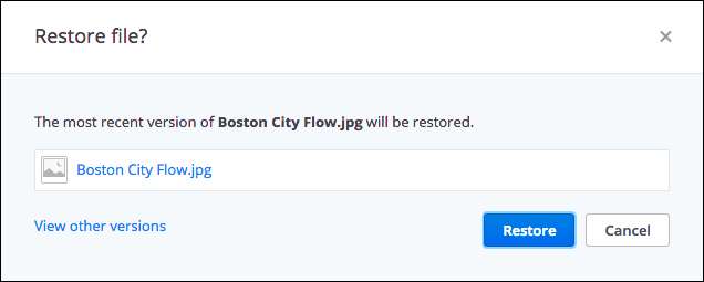 Lorsque vous êtes prêt à restaurer un fichier, Dropbox vous invite avec une boîte de dialogue. S'il existe d'autres versions à afficher, vous pouvez le faire avant de vous engager.