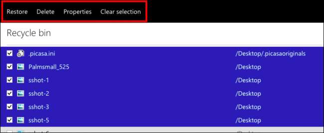 D'un autre côté, si vous souhaitez restaurer ou supprimer certains fichiers, vous devez cocher ceux que vous souhaitez, puis vos options d'action changeront. Vous pouvez «restaurer» ces fichiers, les «supprimer», afficher leurs «propriétés» et enfin effacer la sélection pour recommencer.