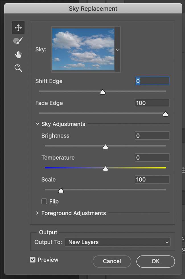 - "Aperçu": la sélection de cette case à cocher bascule l'aperçu de l'image sur ou désactiver. C'est génial de voir comment votre nouveau ciel se compare à l'ancien.