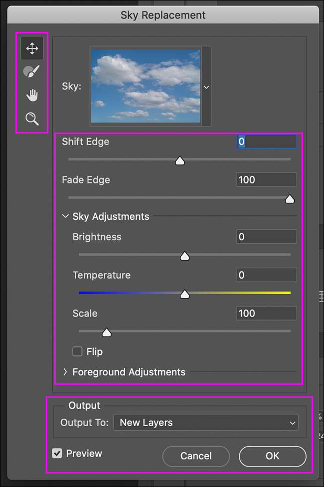 Le reste des options de l'outil de remplacement du ciel est destiné à modifier des choses pour que l'image globale soit naturelle. Vous verrez les outils suivants à gauche: