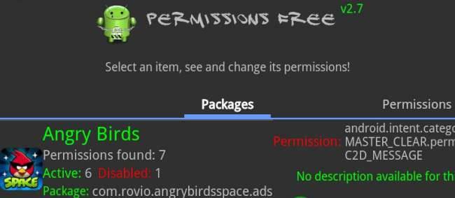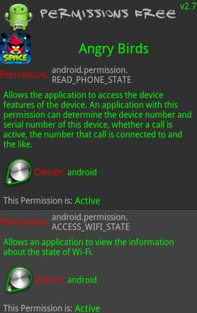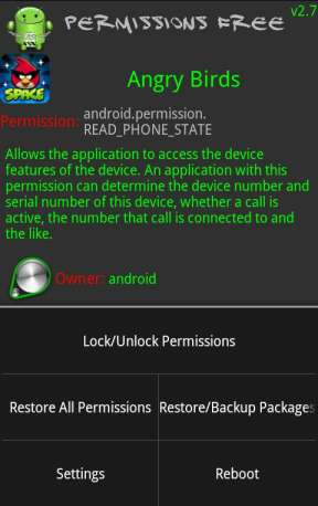 Autorisations refusées explique chaque autorisation en détail. Par exemple, nous pouvons voir qu'Angry Birds Space, ainsi que de nombreuses autres applications, est autorisé à afficher le numéro de série de l'appareil et à surveiller les numéros de téléphone que vous appelez.