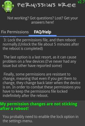 Après le redémarrage, rouvrez Autorisations refusées et vérifiez que l'autorisation apparaît toujours comme refusée. Si le changement d’autorisation n’a pas été respecté, vous devrez peut-être utiliser l’option Verrouiller les autorisations dans le menu - consultez la FAQ / l’écran d’aide de Permissions refusées pour plus d’informations.