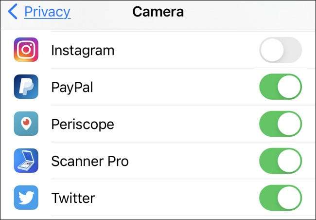 Après cela, vous verrez une liste d'applications qui vous ont demandé l'accès à la caméra dans le passé. Les applications qui ont actuellement accès à votre appareil photo iPhone auront un commutateur vert «sur» au-dessus d'eux. Les applications qui n'ont pas d'accès ont un commutateur "OFF" gris à côté d'eux.