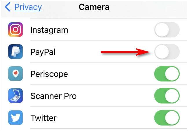 Si vous souhaitez emporter l'accès de la caméra iPhone à partir d'une application, appuyez sur le commutateur à côté de celui-ci dans la liste pour l'éteindre. De même, vous pouvez également accéder à la caméra à une application répertoriée en tournant l'interrupteur.