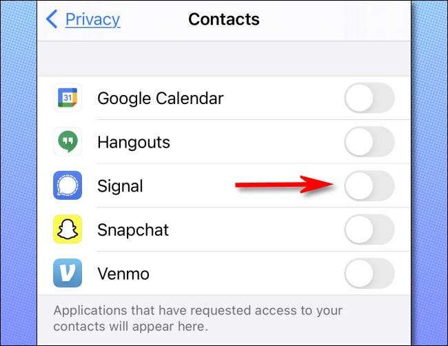 Ensuite, vous verrez une liste de chaque application installée qui a demandé votre accès à vos contacts dans le passé. À côté de chacun, vous verrez un commutateur allumé ou éteint. Si le commutateur est défini sur "On", l'application peut accéder à vos contacts. Si elle est définie "OFF", l'application n'a pas accès à vos contacts.