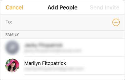 Dans l'écran "Ajouter des personnes" suivant, vous pourrez parcourir votre liste de contacts, saisir manuellement une adresse e-mail ou, comme indiqué ci-dessous, choisir facilement parmi les personnes qui êtes déjà membre de votre forfait Partage familial Apple . Sélectionnez autant de personnes que vous le souhaitez (vous pouvez inviter plus d'une personne à la fois), puis sélectionnez «Envoyer une invitation» dans le coin supérieur droit.