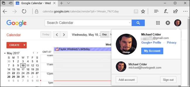 Sans revenir à votre compte principal, accédez à un site Web de marque Google à partir de la barre d'URL, comme calendar.google.com . Vous remarquerez que Google a ouvert l'interface à partir de votre compte par défaut, et non de celui que vous venez d'ajouter. Le système de compte semble vous réinitialiser au mode principal «par défaut» chaque fois que vous accédez à un nouveau site Google. C'est ennuyeux, mais compréhensible; Google insiste pour que vous spécifiiez votre compte secondaire pour éviter les erreurs.