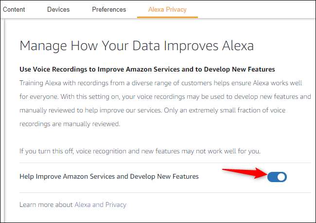Dans l'application Alexa ou sur le Site Web Alexa , appuyez ou cliquez sur Paramètres> Confidentialité Alexa> Gérez comment vos données améliorent Alexa . Désactivez l'option «Aide à l'amélioration des services Amazon et au développement de nouvelles fonctionnalités».