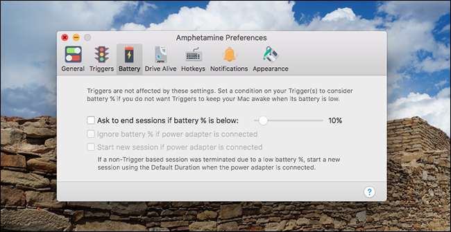 Dans le panneau Batterie, vous pouvez dire à Amphetamine d'arrêter de garder votre Mac éveillé une fois que votre batterie descend à un niveau défini.