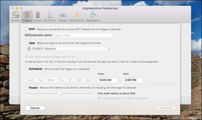 Il y a un panneau que je n'ai pas encore mentionné: les déclencheurs. Cela vous permet de définir des règles sur le moment où votre Mac doit rester éveillé.