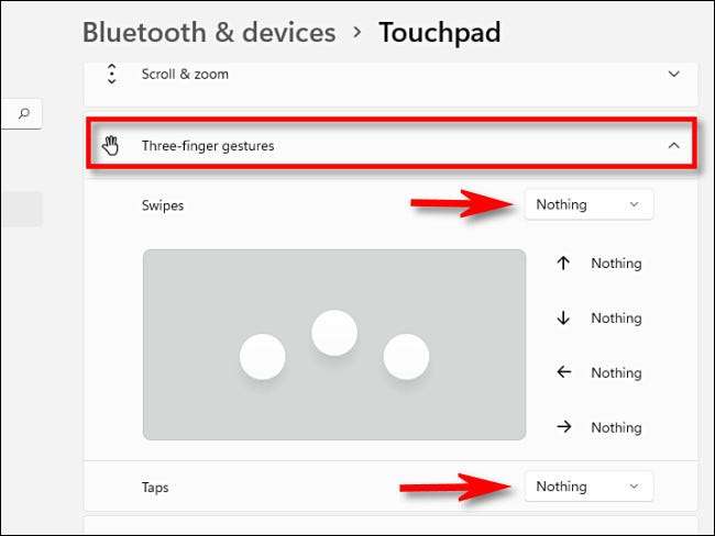 Après cela, cliquez sur l'en-tête "Gestures à trois doigts" pour développer le menu. Cliquez sur le menu déroulant à côté de "Swipes" et sélectionnez "Rien". Faites la même chose avec le menu déroulant "Taps". Cliquez dessus et sélectionnez «Rien» dans la liste.