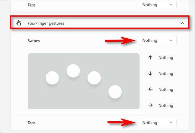 Ensuite, développez le menu "Gestes à quatre doigts" en cliquant sur son en-tête. Comme avec la dernière étape, définissez "Swipes" sur "Rien" à l'aide du menu déroulant, puis définissez "Taps" sur "Rien" aussi.