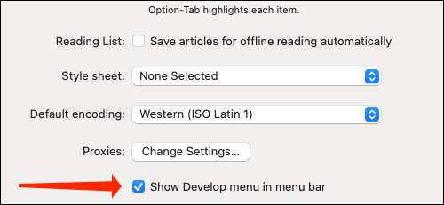 Cochez la case « Afficher le menu Développement dans la barre de menus. »
