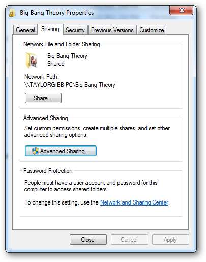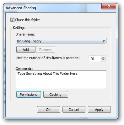 L'ancienne boîte de dialogue de partage avait plus d'options et nous donnait la possibilité de partager le dossier sous un alias différent, elle nous permettait de limiter le nombre de connexions simultanées ainsi que de configurer la mise en cache. Aucune de ces fonctionnalités n'est perdue dans Windows 7 mais est plutôt cachée sous une option appelée «Partage avancé». Si vous faites un clic droit sur un dossier et accédez à ses propriétés, vous pouvez trouver ces paramètres «Partage avancé» sous l'onglet de partage.